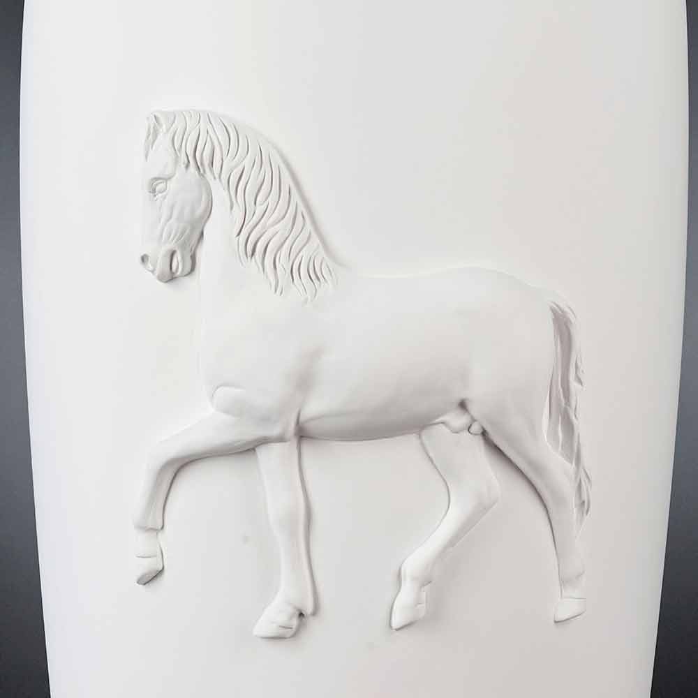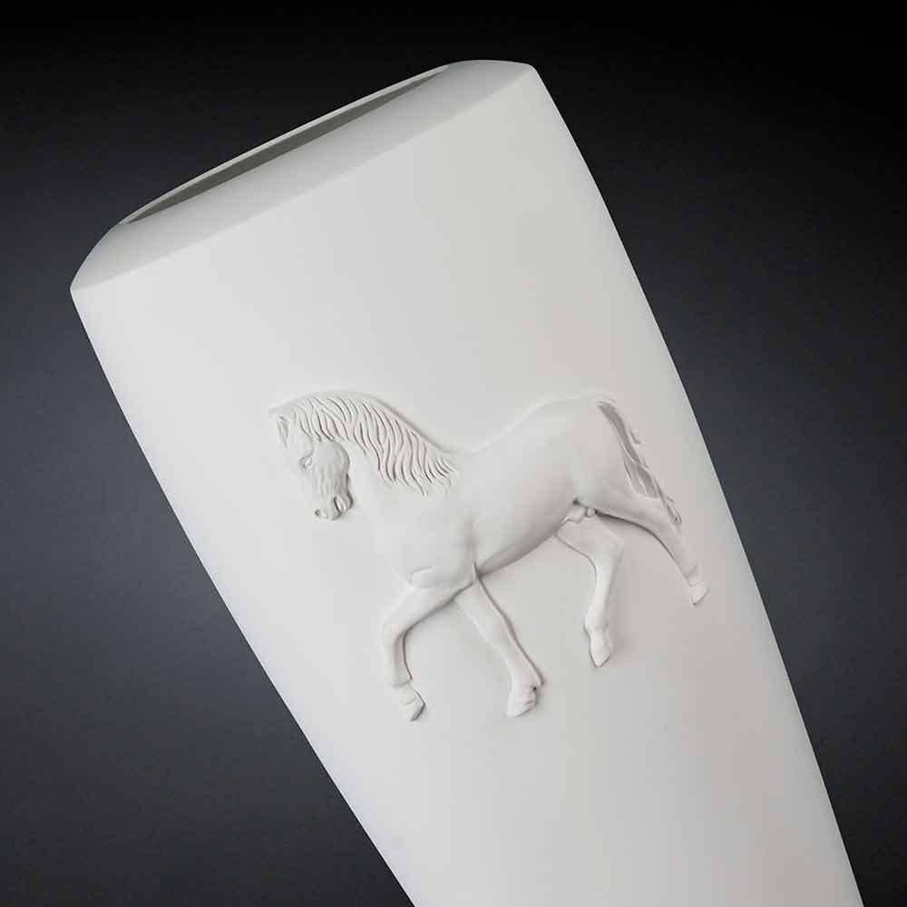 Vaso cerâmico decorativo feito à mão por artesãos italianos, caracterizado por um design moderno. Um cavalo é gravado na superfície.