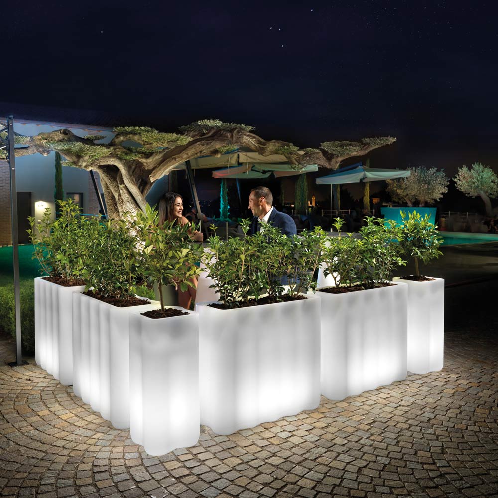 O vaso luminoso para exterior em polietileno pérola fabricado na Itália . A luz LED integrada transforma este vaso de exterior num acessório de decoração com linhas suaves e sinuosas para refletir uma ideia de estilo clássico mas incrivelmente elegante. A estrutura inclui ainda um kit de drenagem de água para explorar a máxima praticidade e funcionalidade deste produto sem descurar o resultado final, um ambiente de luz elegante e sugestivo.