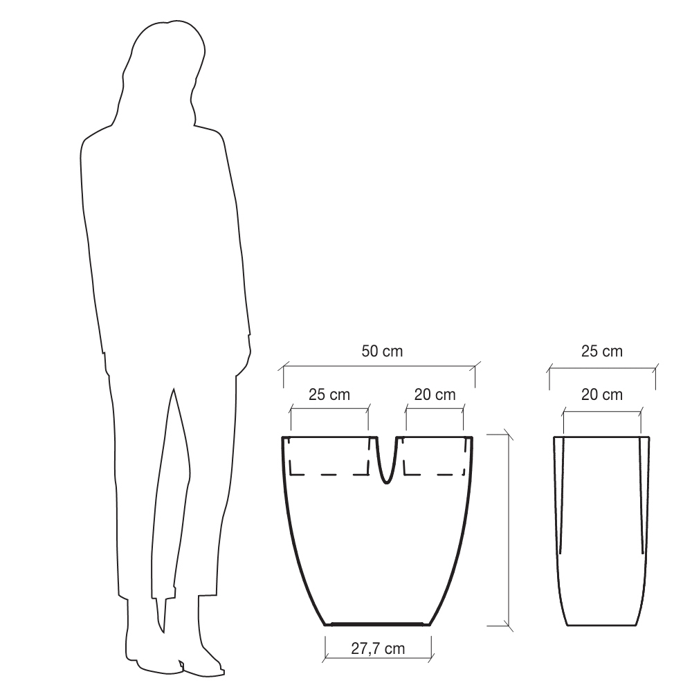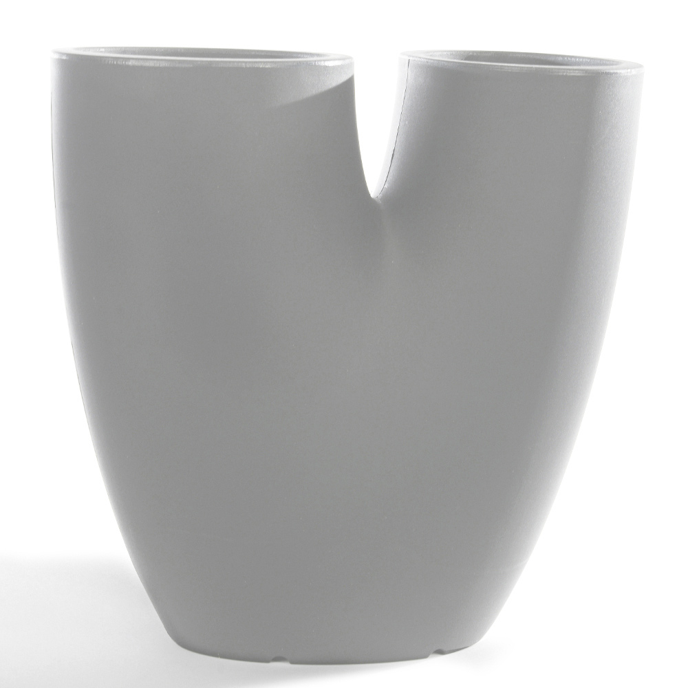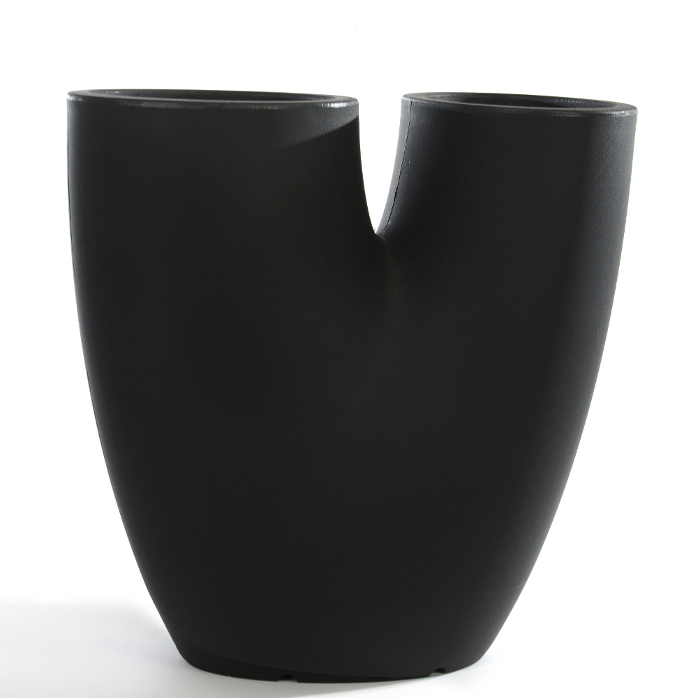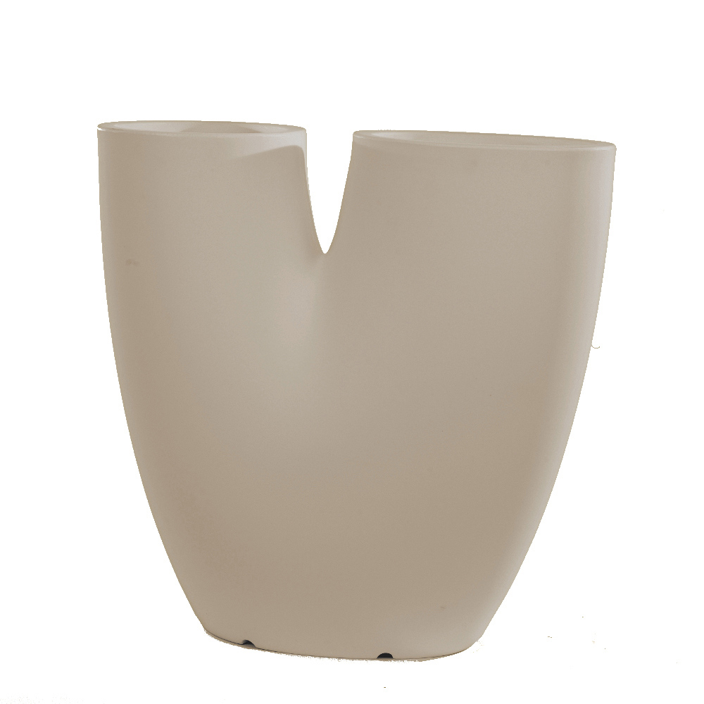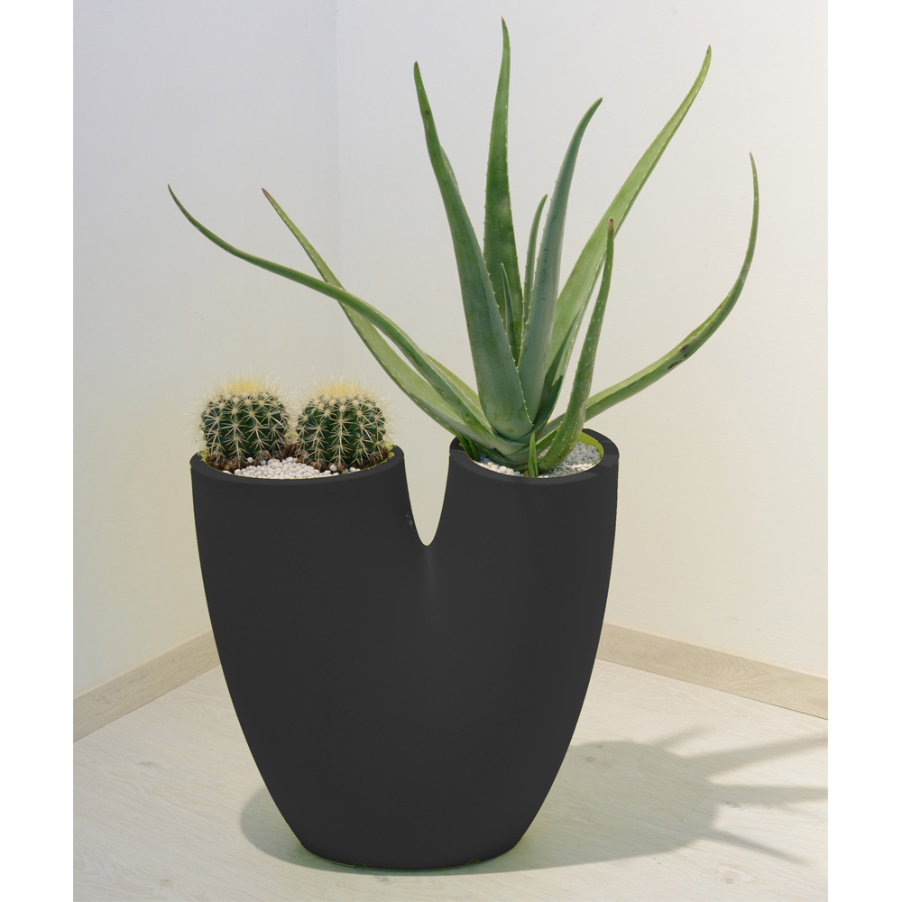 vaso moderno com um design esguio e cativante, pensado para colocar dois tipos de plantas diferentes num só vaso graças aos dois orifícios existentes. Pode ser usado tanto como vaso quanto como porta-vasos. Disponível em diferentes cores, é mais adequado para ambientes externos e internos.