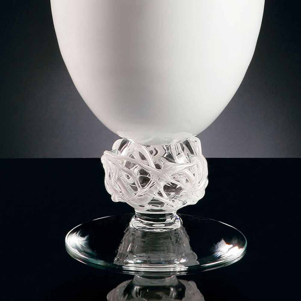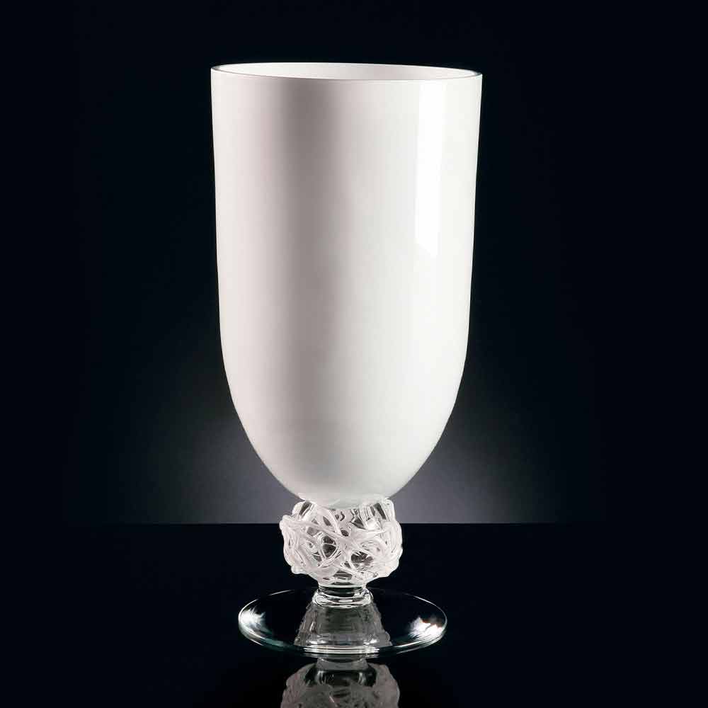 Vaso artesanal para interiores em vidro branco com base transparente Made in Italy.