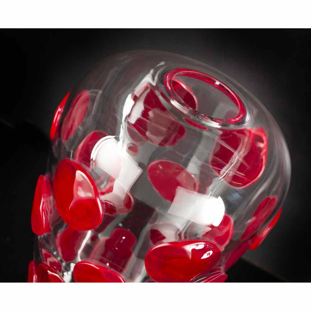 Vaso elegante para interiores em vidro soprado de Murano transparente com detalhes redondos em vermelho vivo feito por um processo inteiramente Made in Italy . Um complemento que combina a extrema elegância do vidro Murano e as suas características maravilhosas com um design moderno e vivo para dar vida a uma ideia de mobiliário exclusivo e vanguardista capaz de enriquecer qualquer espaço doméstico e não com um toque de cor . Um estilo ideal para os mais variados ambientes, desde artigos de decoração até hotéis, restaurantes, áreas comerciais, spas mas também como cenário para eventos e casamentos.