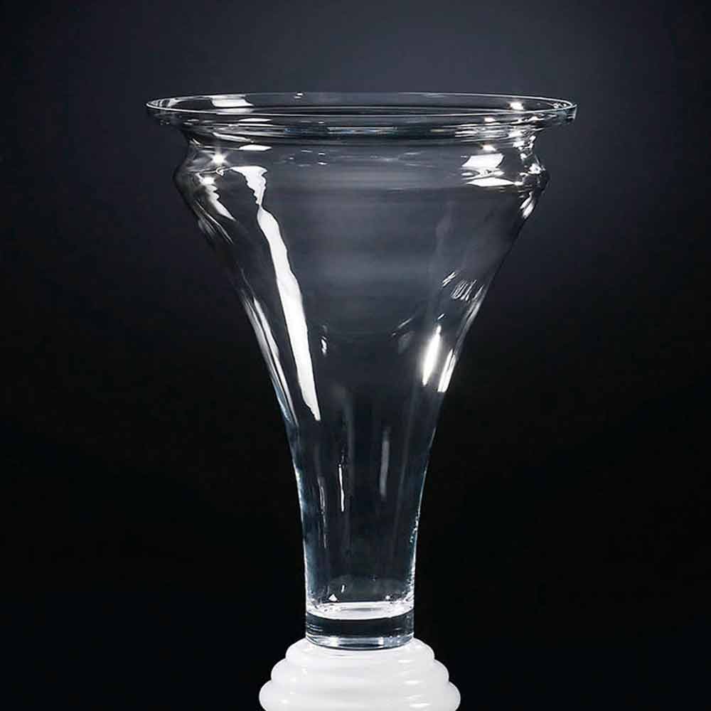 Vaso elegante para interiores em vidro transparente com fundo de vidro branco feito com processamento 100% Made in Italy . Um complemento requintado cuja estrutura oferece um design requintado, propondo uma figura caracterizada por formas suaves perfeitas para decorar e completar ambientes com uma estética sofisticada e elegante graças também à elegância intemporal do vidro, um material de qualidade e alto valor . Uma peça de mobiliário ideal para os mais variados ambientes, desde artigos de decoração a hotéis, restaurantes, zonas comerciais, spas mas também como cenário para eventos e casamentos.