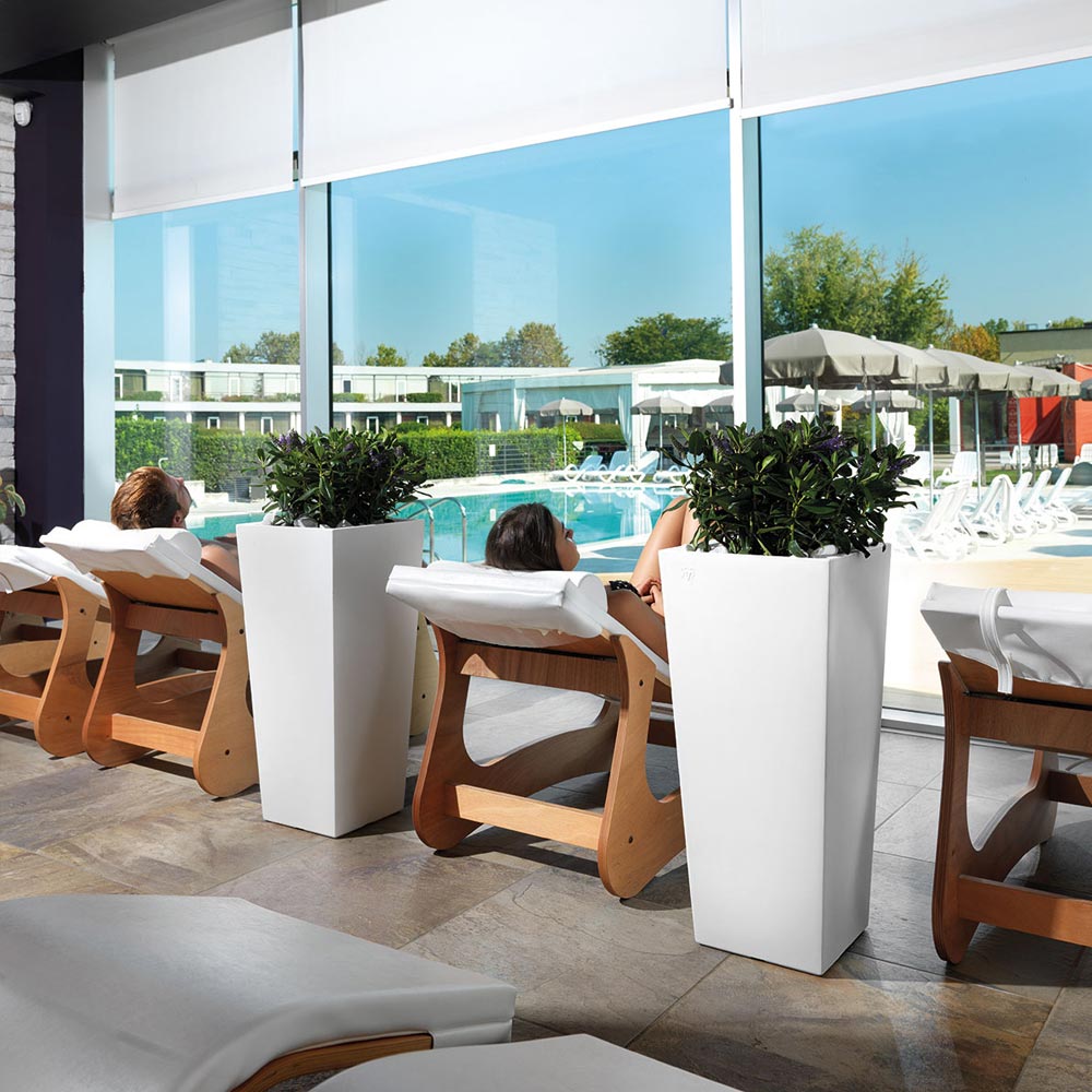 Concebido para enriquecer os espaços exteriores com grande requinte paisagístico, este vaso exterior está disponível em 7 acabamentos diferentes e 3 tamanhos e alturas diferentes que transmitem um forte sentido de versatilidade para criar uma atmosfera elegante e extravagante ao mesmo tempo.