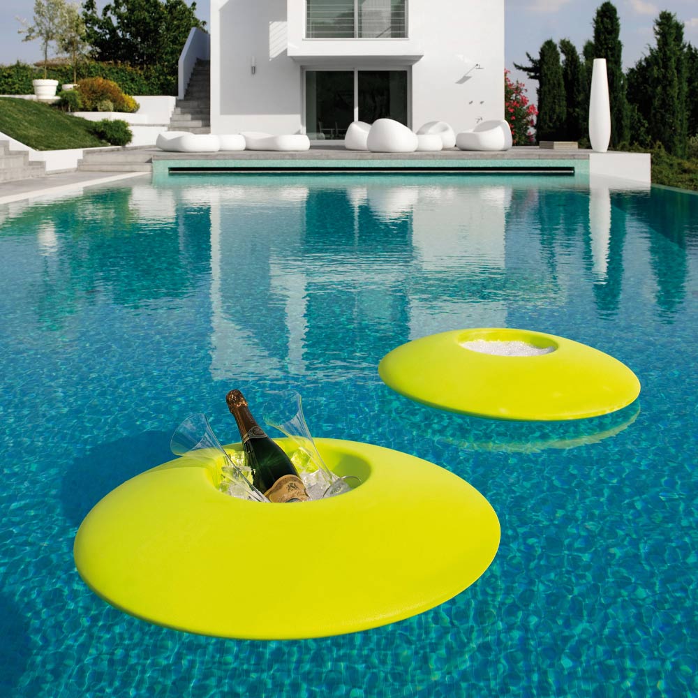 prático recipiente flutuante em situações como piscinas ou spas onde, além de enriquecer o mobiliário envolvente com cor, oferece uma solução particularmente funcional.
