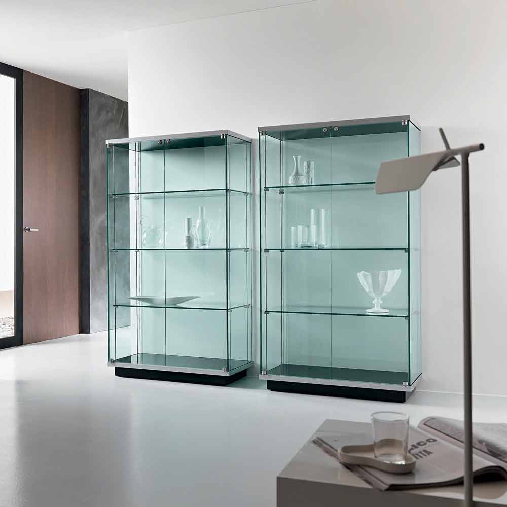 O expositor de duas portas com fechadura é inteiramente em vidro temperado transparente com três prateleiras com fundo, tampo e rodapé em madeira lacada a preto.