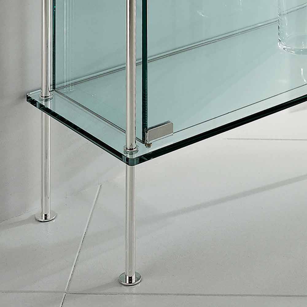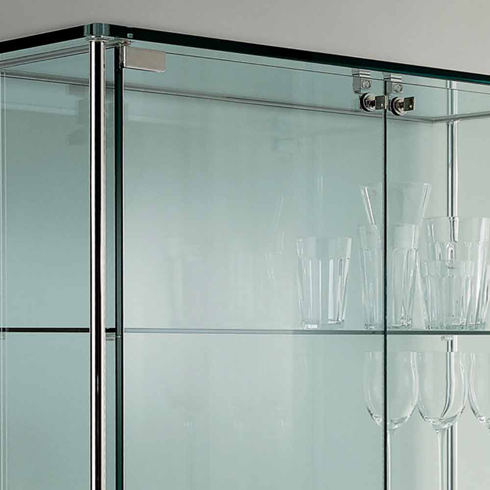 O expositor de duas portas é feito inteiramente de vidro temperado transparente com fechamento e suportes de metal em aço inoxidável.