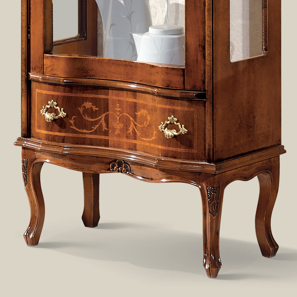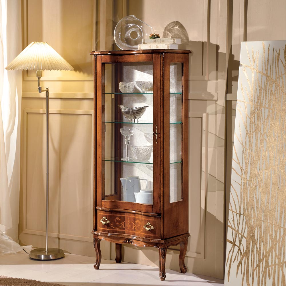 Vitrine de sala de estar clássica em madeira de nogueira com porta e gaveta Made in Italy.